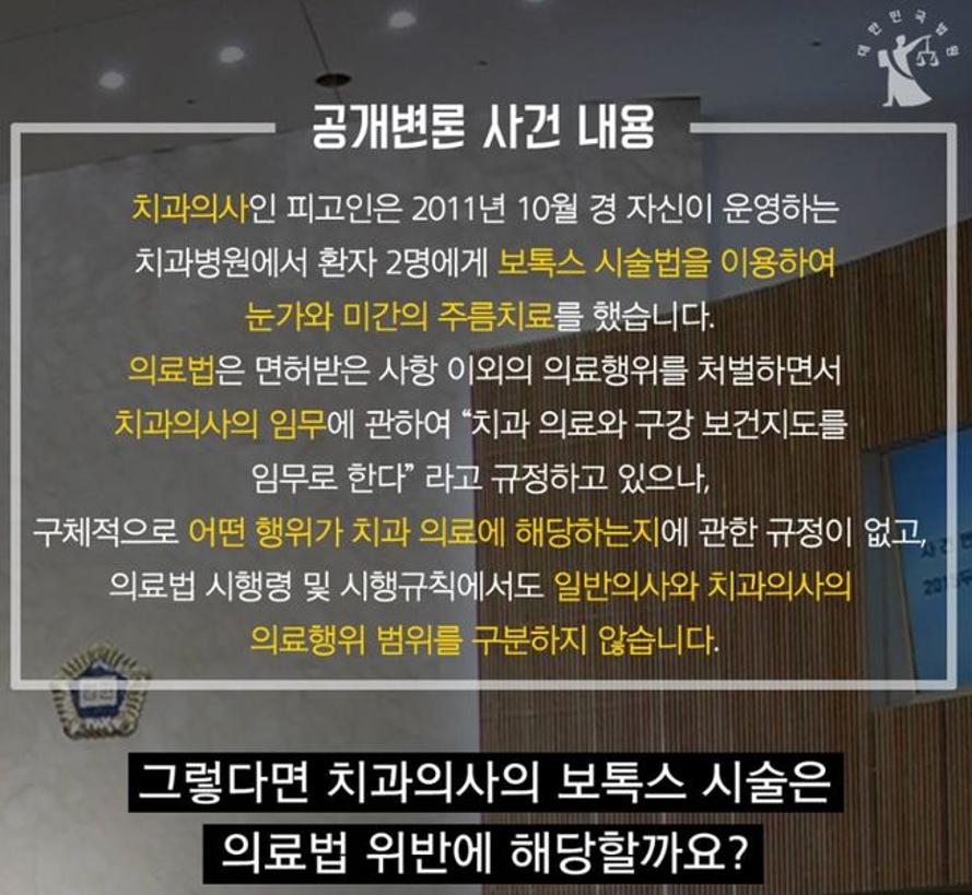 이에 대해 법원은 1심과 2심에서 보톡스 시술이 치과의사의 면허 범위를 벗어난다고 판단, 각각 선고유예, 벌금 100만원 유죄 판결을 선고했다.