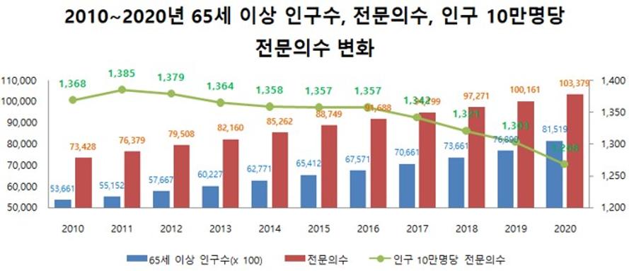 국가통계포털 자료를 살펴본 결과 2010년부터 2020년까지 10년간 65세 이상 인구는 51.9% 증가했다. 반면 전문의 수는 40.8% 증가해 65세 이상 인구 10만 명당 전문의 수는 7.3% 감소했다.