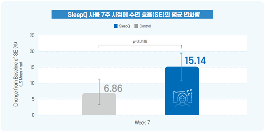 실제로 불면증 환자를 대상으로 진행한 허가 임상시험에서 수면 효율을 유의미하게 향상시킨 것으로 나타났다. 슬립큐로 치료받은 환자군은 7주 시점에 수면 효율 비율이 기저치(Baseline) 대비 15.14% 향상됐다. 수면 효율은 환자의 수면 데이터를 기반으로 하는 객관적, 정량적 지표다.
