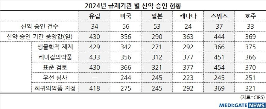 조사 결과 2024년 신약 승인 기간 중앙값은 일본이 290일로 가장 짧았으며, 미국 356일, 캐나다 363일, 호주 369일, 유럽 430일, 스위스 444일 순으로 확인됐다.