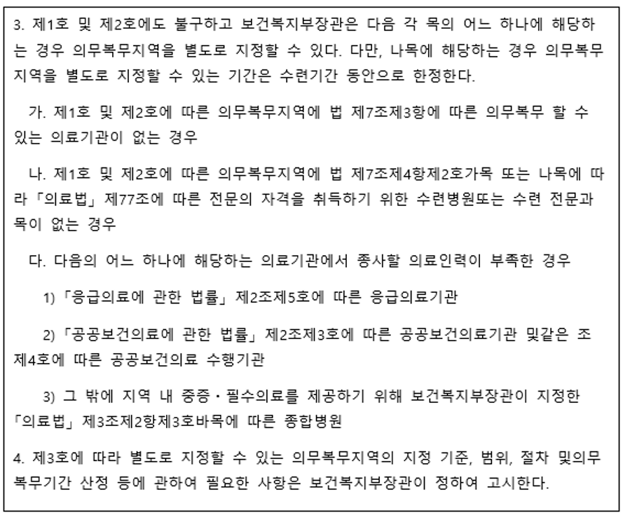 이 규정대로 라면 응급, 공공, 필수 의료인력이 부족한 종합병원이나 공공의료기관은 수도권 지역이라도 보건복지부장관의 지정, 고시만으로 지역의사제 의무복무를 할 수 있다. 수도권 공공의료기관에는 '어느 정도 지위를 가진 분들의 기회'는 언제나 열려 있는 셈이다.