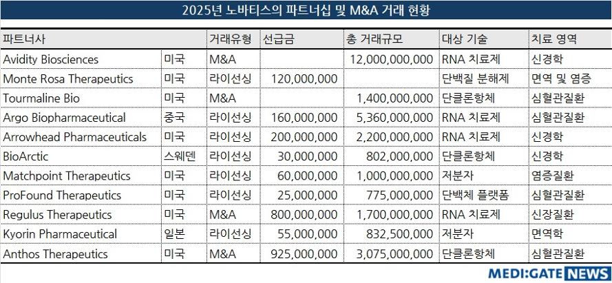 한편 노바티스는 2023년 제네릭 및 바이오시밀러 사업부인 산도스(Sadoz)를 분사한 뒤 혁신 신약 중심으로 포트폴리오를 강화하고 있다. 지난 몇 년간 선택과 집중을 강조하며 임상 단계 프로그램을 40% 가까이 줄이는 대신 고부가가치 의약품에 집중해왔으며, 핵심 치료 분야와 차세대 기술 플랫폼 확보에 중점을 두고 있다.