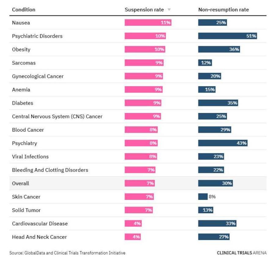 미국을 기준으로 2020년 1분기 모집단계였던 임상시험의 7%가 2년 내로 중단됐으며, 이중 30%는 재개되지 못했다. 정신 장애(Psychiatric Disorders) 분야는 10%의 중단율을 보였으며, 비재개율은 51%로 가장 높았다. 오심, 비만 등은 각각 11%, 10%, 육종과 부인암도 9%대로 높은 중단율을 보였으나, 비재개율은 다소 낮은 편이었다.