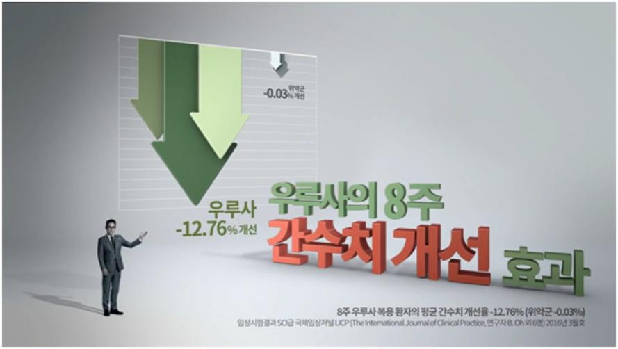 광고에서는 "좋아 보이는 것과 정말 좋은 것의 차이, 팩트를 보면 알 수 있습니다. 1961년 발매되어 57년 동안 대한민국의 간을 지켜온 국내 판매 1위 간장약 우루사. 우루사는 임상시험에서 간수치 개선과 피로 회복 효과가 검증되었습니다. 이제 기준은 팩트입니다. 선택은 우루삽니다"라고 말하고 있다.