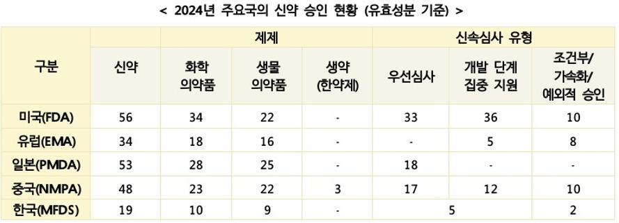 한국은 2024년 승인된 신약 19건 중 5건이 글로벌 혁신제품 신속심사 제도(GIFT)를 통해 승인됐다. 2025년 9월까지의 통계에 따르면, GIFT 품목의 평균 심사 소요 기간은 70일(근무일 기준)로, 법정 처리 기한 대비 약 25%의 기간 단축 성과를 거두며 국내 신약의 신속한 시장 진입을 지원하고 있다