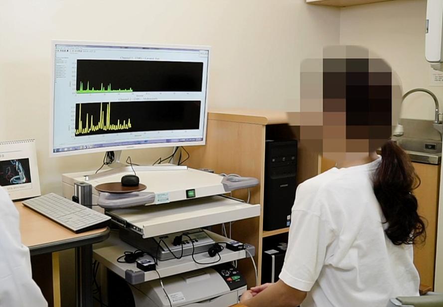 모니터를 통해 배변 훈련을 하는 바이오피드백 치료 장면 - 대한소화기기능학회 교육 자료.