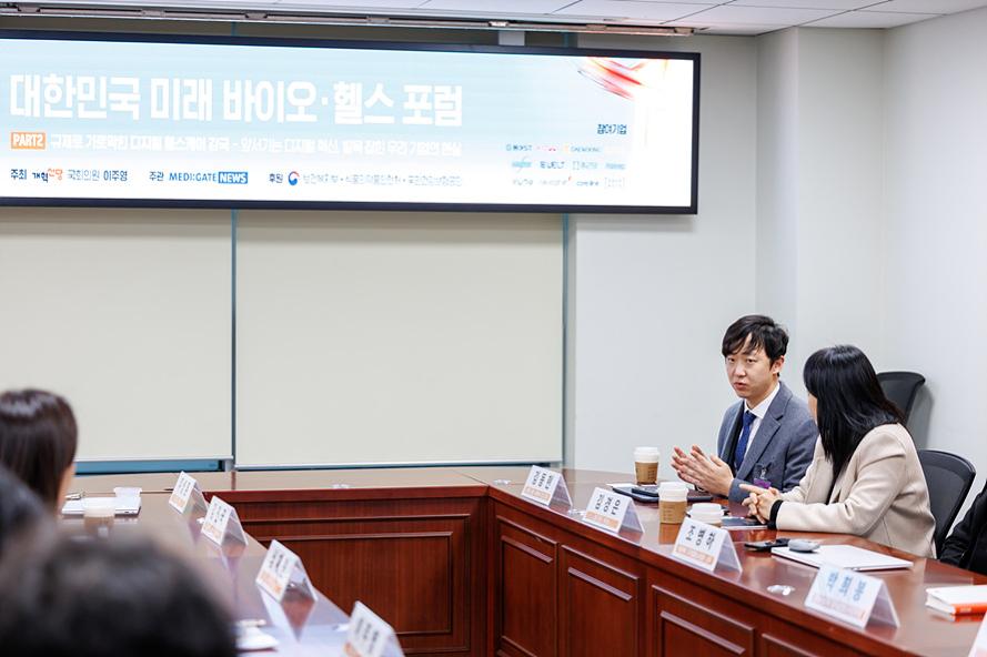 김동현 대표이사가 대한민국 미래 바이오헬스 포럼 사전 간담회에서 디지털 헬스케어 정책 제언을 하고 있다.