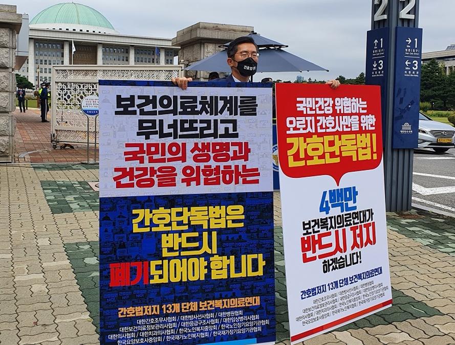 13보건복지의료연대는 이필수 회장을 시작으로 4일부터 릴레이 1인 시위를 전개하는 한편, 국회 법제사법위원회에 계류된 간호법 제정안의 동향을 예의주시하며 강력 대처해나갈 예정이다.