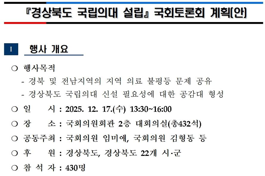 '경상북도 국립·공공의대 설립' 국회토론회 계획안.