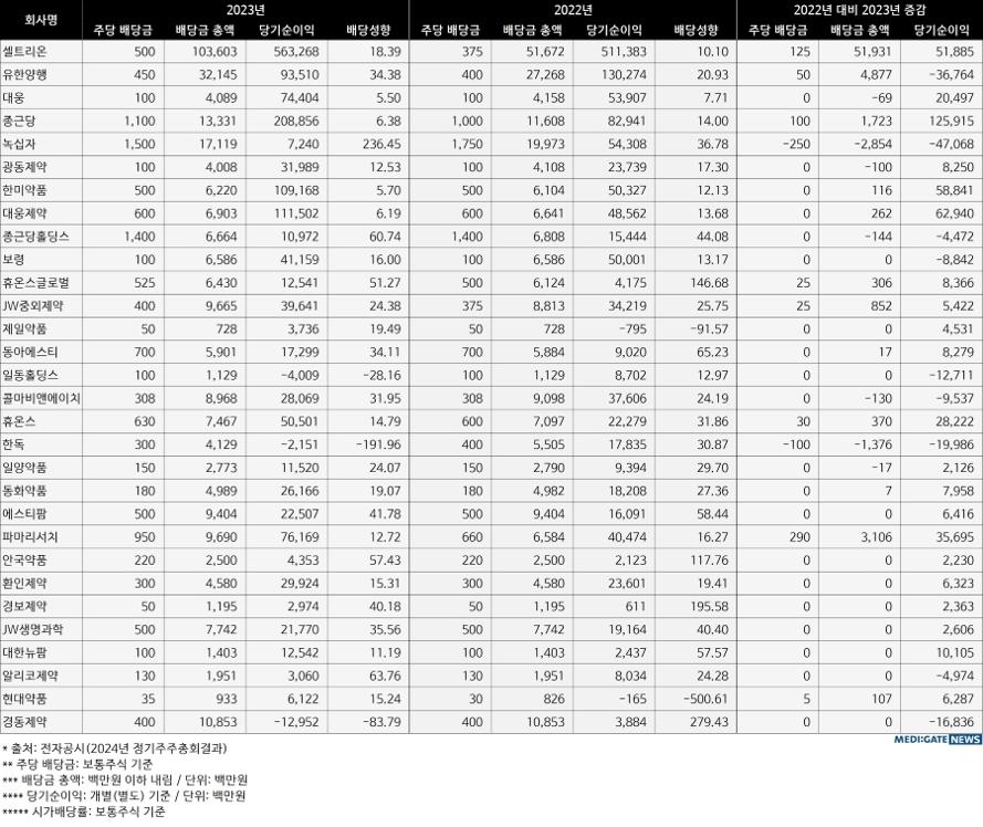 지난해 대비 총배당금을 늘린 기업은 셀트리온, 유한양행, 파마리서치, 종근당, JW중외제약, 휴온스, 휴온스글로벌, 대웅제약, 한미약품, 현대약품, 동아에스티, 동화약품 등 12곳이다.
