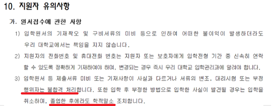 부산대 의전원 모집요강은 "입학원서 등 제출서류 미비 또는 기재사항이 사실과 다르거나 서류의 변조, 대리시험 또는 부정행위자는 불합격처리한다. 졸업한 후에라도 학적말소 조치한다"고 명확히 명시하고 있다.