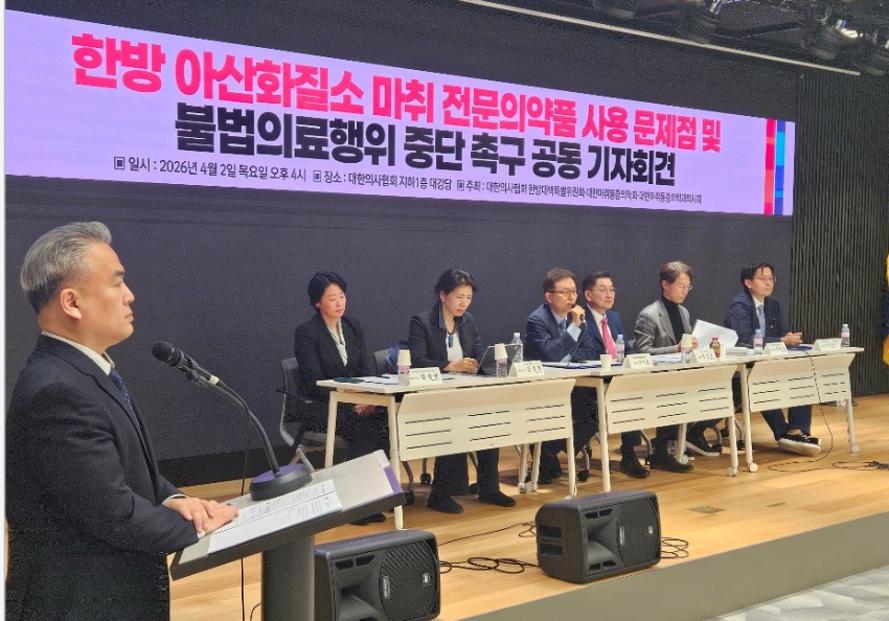 대한의사협회 한방대책특별위원회·대한마취통증의학회·대한마취통증의학과의사회는 2일 의협 회관 지하 강당에서 '한방 아산화질소 마취 전문의약품 사용 문제점 및 불법의료행위 중단 촉구 공동 기자회견'을 개최했다.
