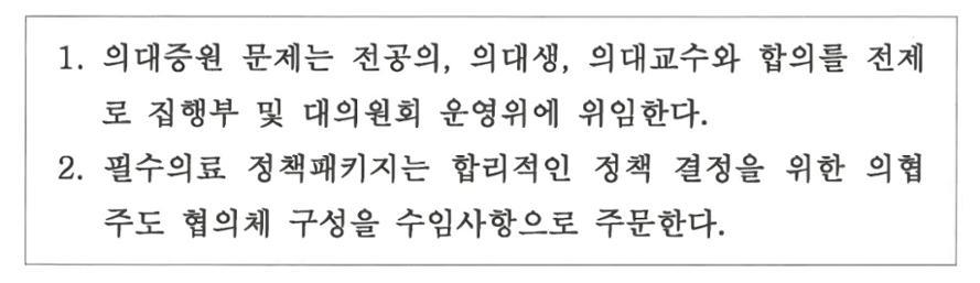 대의원회는 지난 2024년 제76차 정기대의원총회에서 '의대증원 문제는 전공의, 의대생, 의대교수와 합의를 전제로 집행부 및 대의원회 운영위에 위임한다'고 수임사항을 결정했다.