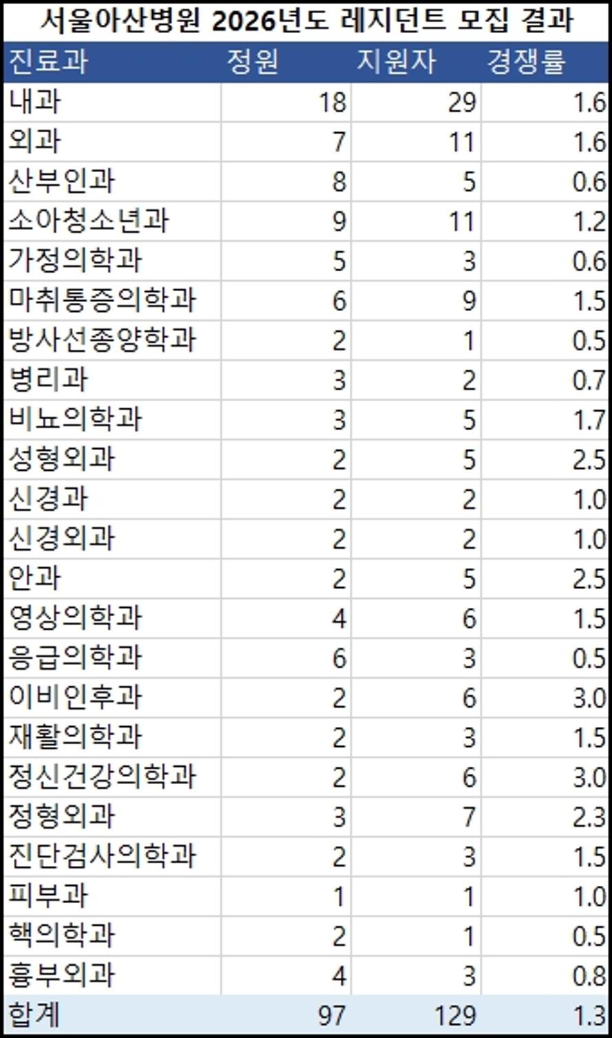 9일 메디게이트뉴스가 입수한 서울아산병원 2026년도 레지던트 1년차 지원 결과에 따르면, 총 23개 과목 모집인원 97명에 지원자는 129명으로 경쟁률 1.3대 1을 기록했다.