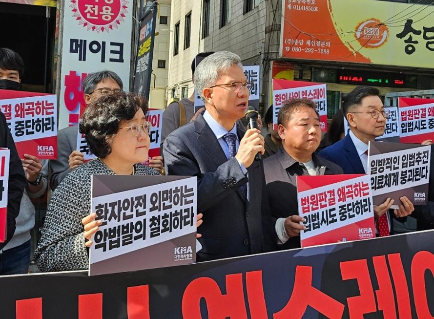 대한의사협회 김택우 회장은 23일 더불어민주당 서영석 의원 부천사무소 앞에서 '한의사 엑스레이 사용 의료법 개정안 규탄 집회'를 개최했다.