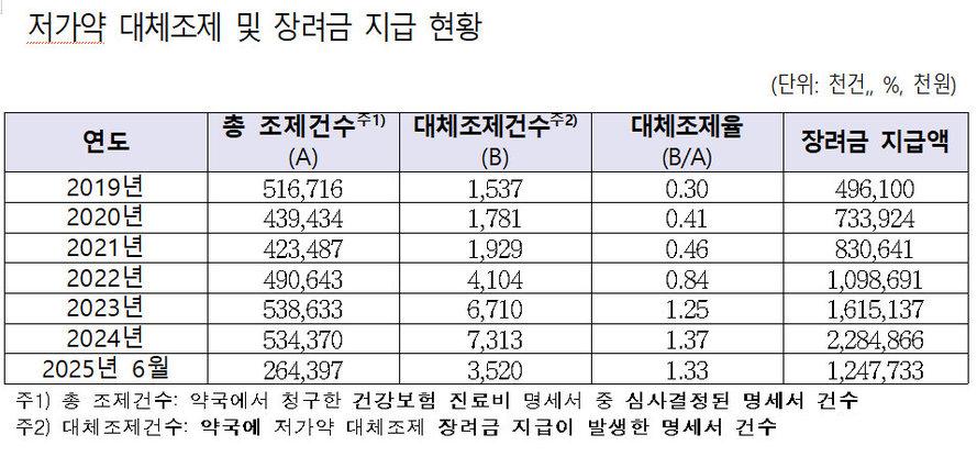 또한 저가약 대체조제에 따른 장려금은 지난해 22억 8486만원으로 2023년 16억 1513만원보다 41.5% 증가한 것으로 나타났다.