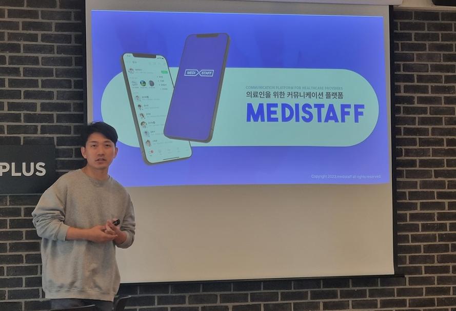 메디스태프 기동훈 대표는 25일 서울 강남구 대륭서초타워 스파크플러스에서 열린 투자설명회(IR)에서 “현재 커뮤니티 플랫폼으로 개발이 끝난 상태인데, 최종적으로는 메신저 플랫폼으로 나아갈 것”이라며 이같이 말했다.