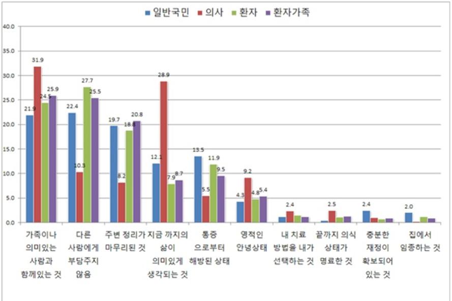 이와 함께 아름다운 삶의 마무리를 위해 중요한 요인으로 일반인(22.4%)과 환자(22.7%)는 '다른 사람에게 부담주지 않음'을 1위로 꼽았지만, 환자가족(25.9%)과 의사(31.9%)는 '가족이나 의미 있는 사람과 함께 있는 것'을 1위로 답했다. '아름다운 삶의 마무리를 위한 요인'에 대한 답변