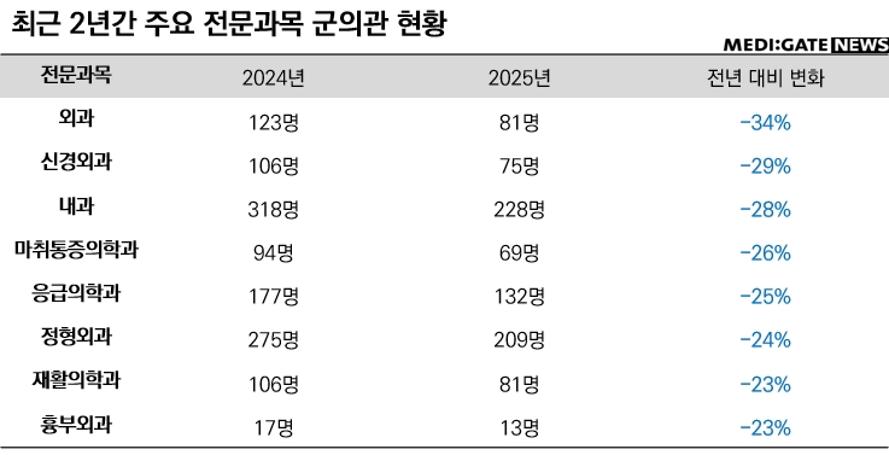 이처럼 전문의 군의관이 크게 줄어든 것은 지난해 의정갈등의 영향으로 배출된 전문의가 예년 대비 대폭 줄어든 게 결정적이었다.