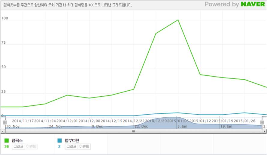 하지만, 상품명으로 검색하면 얘기는 달라집니다. 바레니클린과 부프로피온의 대표 약인 '챔픽스'와 '웰부트린'으로 검색하면, 챔픽스가 압도적으로 더 많이 대중들에게 이슈화 되어 있습니다.