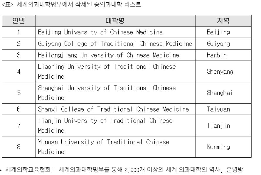 우리나라 한의대는 지난 2012년 세계의과대학명부에서 삭제됐으며, 지난 1월 싱가포르에서 열린 세계의학교육협회 회의에서는 우리나라 한의대의 세계의과대학명부 등재 불가를 재확인했다.
