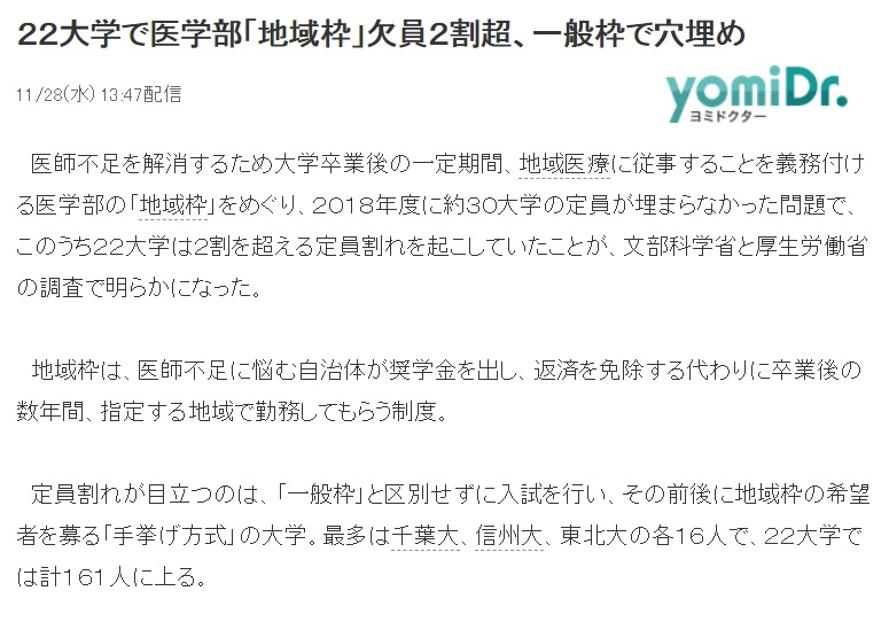 29일 일본 요미우리신문, 고베신문 1면 기사 등에 따르면, 전국 의대에서 운영하는 지역 정원제도의 별도 전형 지원자가 22개 의대에서 20%이상, 161명의 정원이 미달됐다. 일부 의대는 미달된 정원을 일반 학생의 지원을 받는 것으로 전환할 계획을 밝혔다.