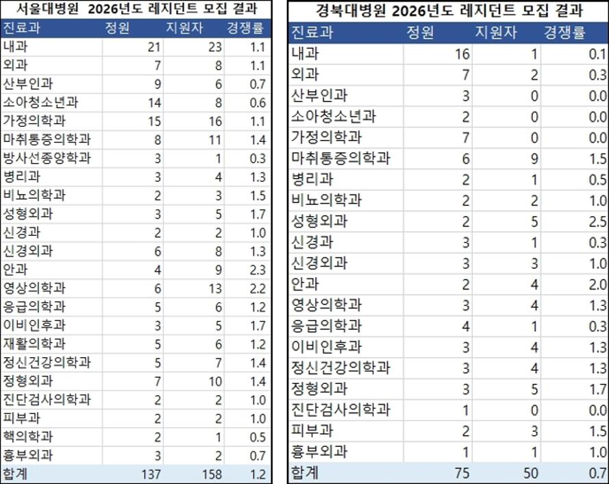 반면 지방 수련병원들은 처참한 성적표를 받아들었다. 경북대병원은 75명 선발을 계획했지만 지원자가 50명(경쟁률 0.6대 1)에 그쳤고, 부산대병원(정원 63명∙지원자 53명, 0.8대 1), 건양대병원(정원 32명∙지원자 18명, 0.56대 1) 등도 정원 미달을 기록했다.