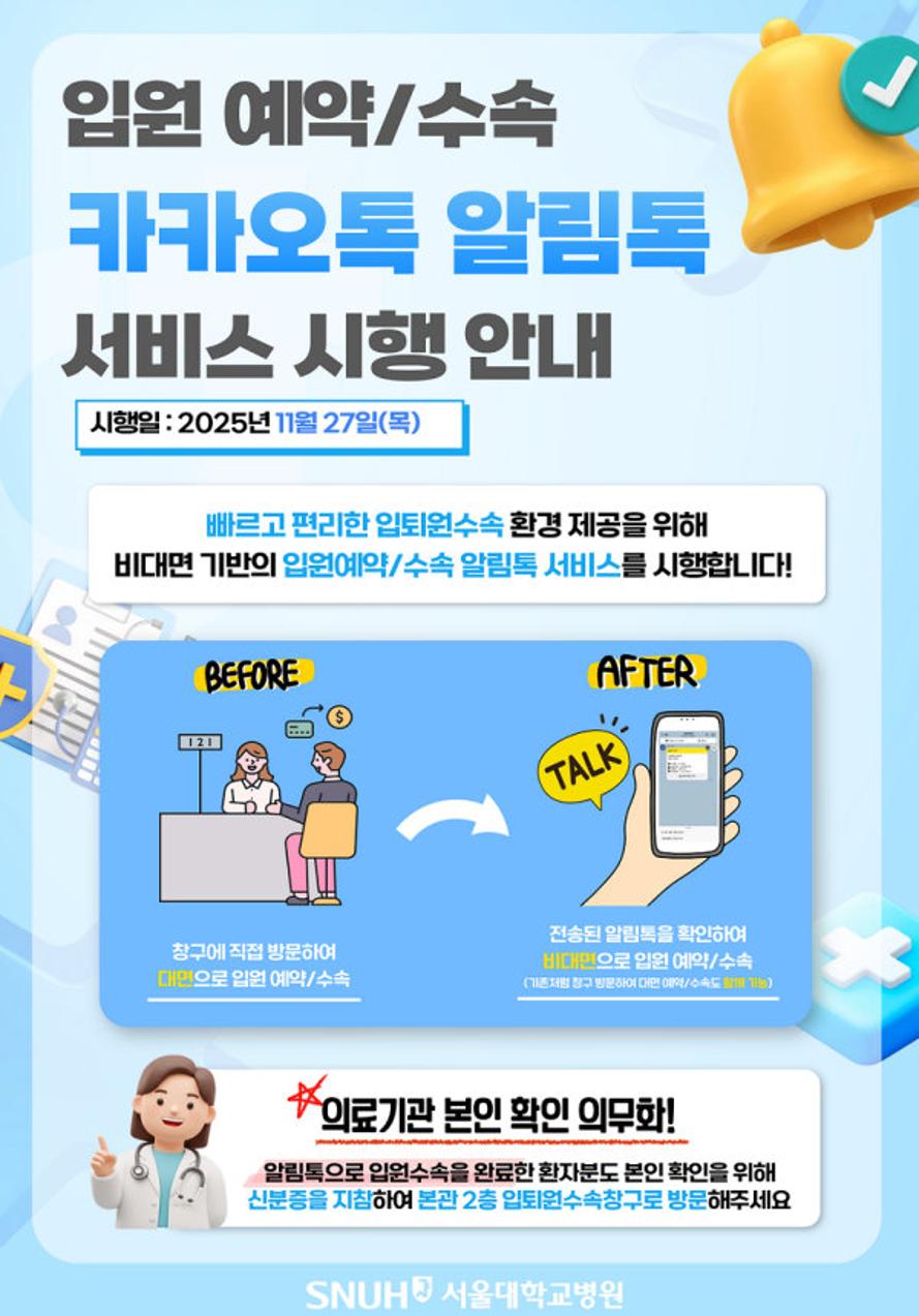 서울대병원은 지난달 27일 '카카오톡 알림톡 기반 입원예약·수속 시스템'을 공식 오픈했다고 3일 밝혔다.
