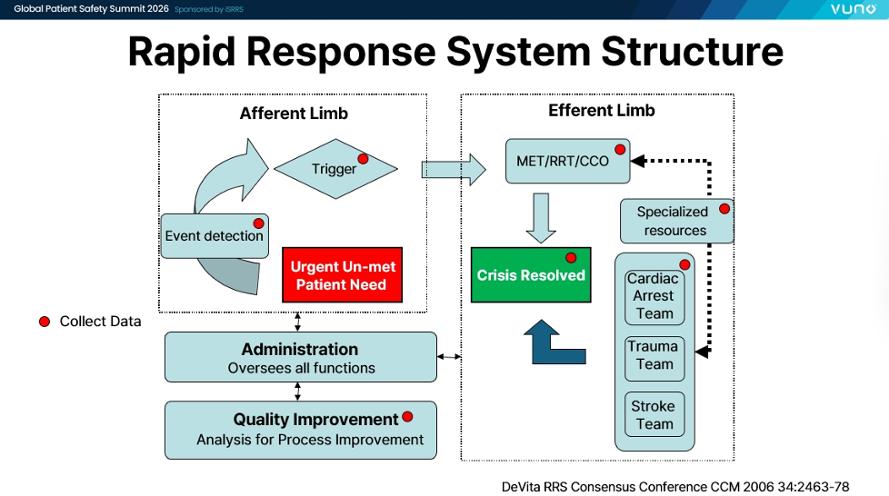 데비타 교수는 심정지 발생시 출동하는 신속대응팀만으로는 더 많은 환자의 생명을 구하는 데 한계가 있다며, ▲구심성 요소(Afferent limb∙환자의 악화 징후 감지) ▲원심성 요소(Efferent limb∙감지 후 대응) ▲질 관리 요소(Quality improvement limb∙데이터 분석 기반 프로세스 개선) ▲행정 요소(Administrative limb∙시스템 운영 총괄) 등 4가지 요소가 모두 제대로 갖춰져야 한다고 강조했다.
