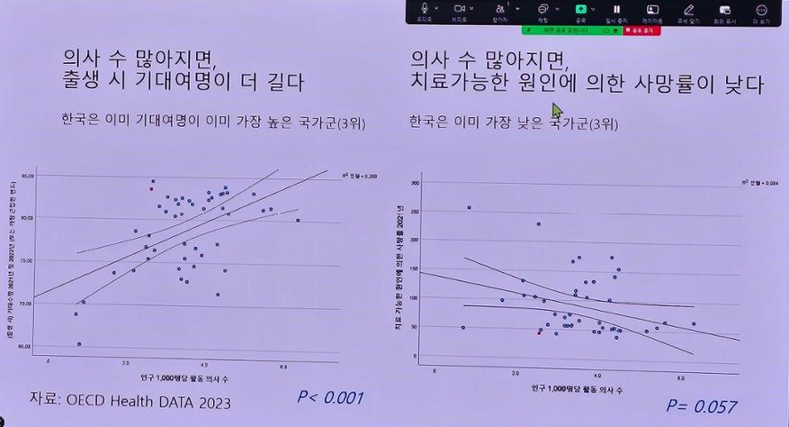 그는 "다시 말해 이미 천장효과가 도래했기 때문에 의사 수를 늘려서 더 올릴 수 있는 건강 지표는 없다. 입원 가능한 치료 가능 사망률, 회피 가능 사망률은 이미 최저로 낮게 유지하고 있다. 미래 사회에선 (의사 수를 늘리기 보다) 주치의 서비스를 통해 환자 건강 지표를 높일 수 있는 것이 더 많고 가치가 있을 것"이라고 덧붙였다.