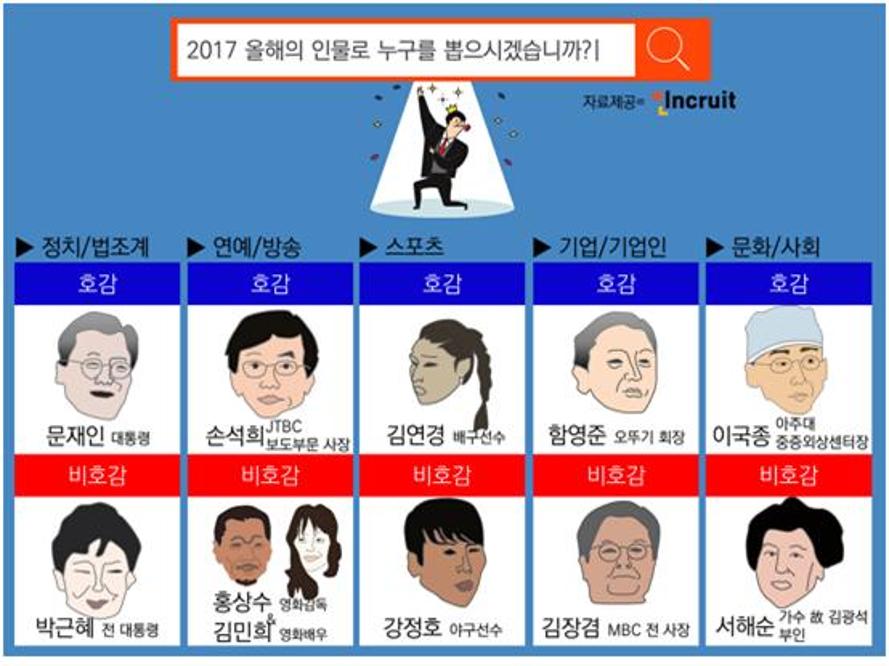 설문 결과, 정치·법조계 분야의 문재인 대통령이 호감도 51.0%로 올해의 호감인물 1위를 차지했다. 그 다음은 기업·사회 분야에서 함영준 오뚜기 회장(50.0%)이 2위에 올랐다. 문화·사회 분야의 아주대병원 중증외상센터장 이국종 교수가 38.3%의 득표로 3위에 올랐다. 이어 방송·연예 JTBC 손석희 보도부문 사장(31.4%), 스포츠 분야 김연경 배구선수(24.1%) 순이었다.