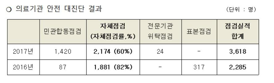 권 의원이 복지부로부터 제출받은 ‘의료기관 안전대진단 추진계획 및 결과 보고서’에 따르면, 의료기관 안전 대진단은 2016년 2285개소, 2017년 3618개소를 대상으로 실시했다. 이중 전문가와 공무원 등이 현장에 함께 점검하는 민관합동점검은 2016년 87개소, 2017년 1420개소에 그쳤다. 나머지는 병원 자체적으로 실시한 자체점검이었다.