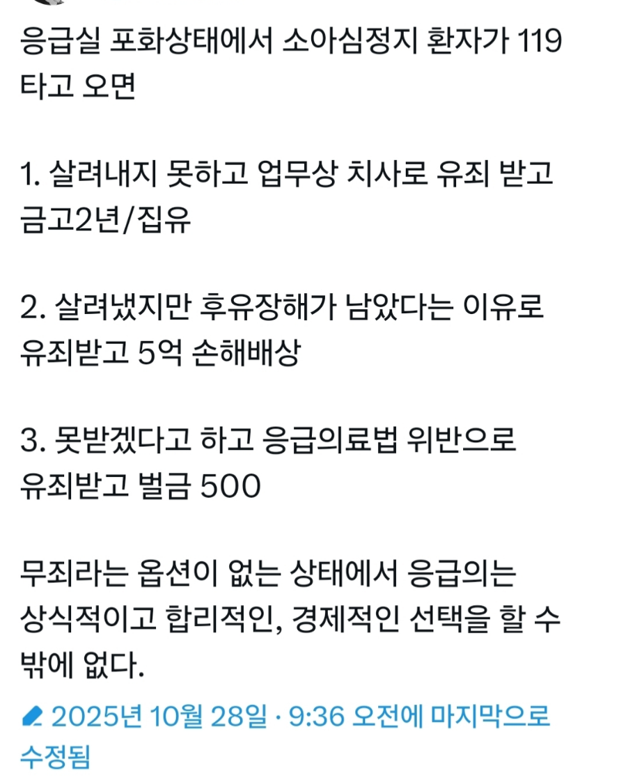 이어 그는 "무죄라는 옵션이 없는 상태에서 응급의는 상식적이고 합리적인, 경제적인 선택을 할 수밖에 없다"고 강조했다.