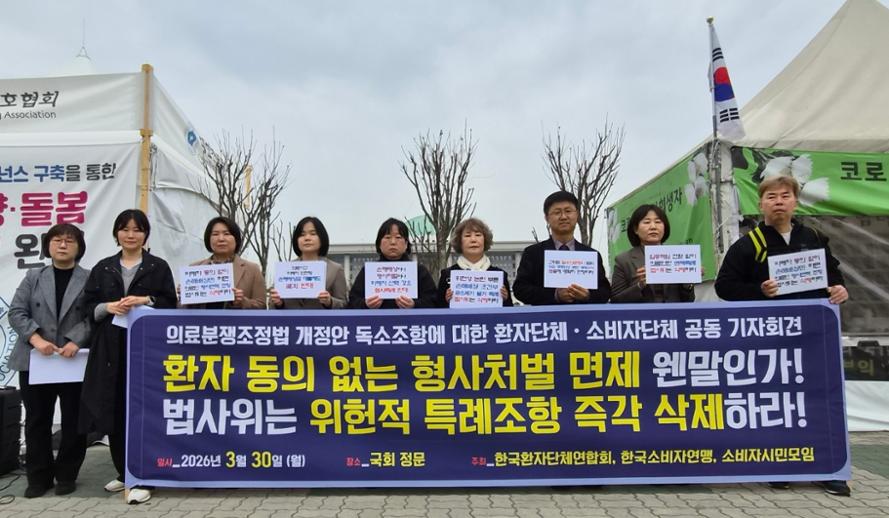 [메디게이트뉴스 하경대 기자] 환자단체가 30일 중대과실이 없는 경우 기소를 제한하는 '의료분쟁조정법 개정안'과 관련해 "환자 동의 없는 형사처벌 면제는 있을 수 없다"며 "형 감면 정도가 사회적으로 합의할 수 있는 수준의 형사특례 범위"라고 주장했다.