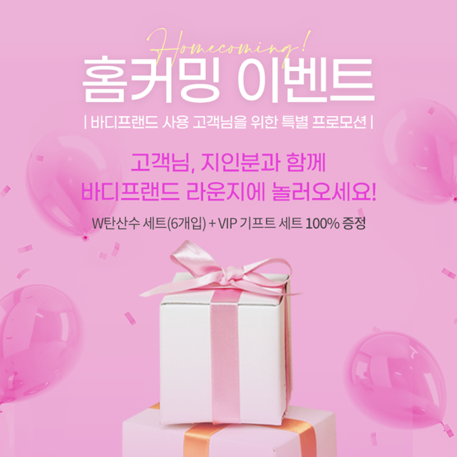 바디프랜드가 준비한 홈커밍 기프트도 받을 수 있다. 라운지에 방문만 해도 고객은 물론 함께 방문한 지인 모두에게 W탄산수 세트(6개입)와 VIP 기프트 세트를 증정한다.