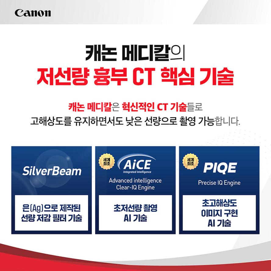 캐논 메디칼은 ‘사람을 향한 혁신’이라는 가치를 기반으로 환자와 의료진의 안전까지 고려한 혁신 기술을 선보이고 있다. 캐논 메디칼의 저선량 흉부 CT는 3가지 핵심 기술인 실버 빔(SilverBeam), AI 기술인 AiCE(Advanced intelligence Clear-IQ Engine)와 PIQE(Precise IQ Engine, 피크)로 낮은 선량으로도 고해상도 이미지가 구현된다.