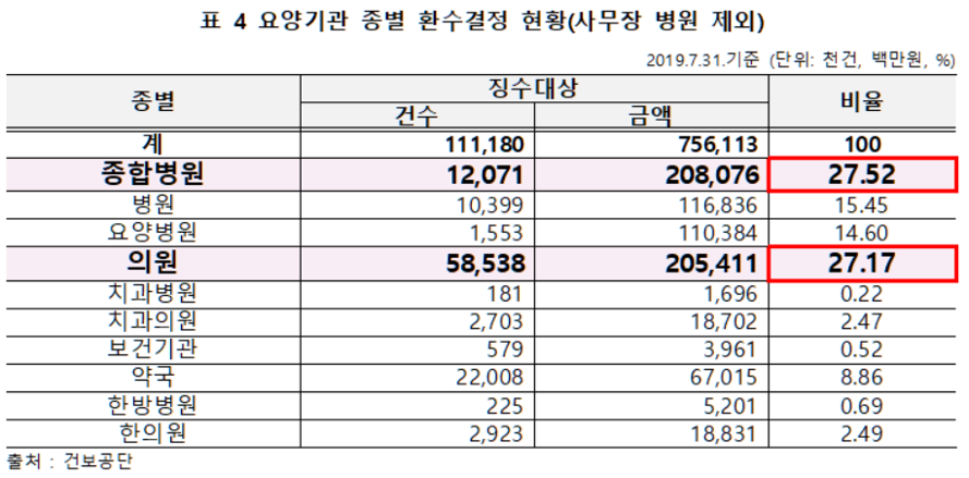 요양기관 종별 환수결정 현황으로 보면 종합병원급 의료기관이 2080억원 전체의 27.5%로 가장 많았고 의원급 의료기관이 2,054억원(27.1%)으로 다음 순이었다.