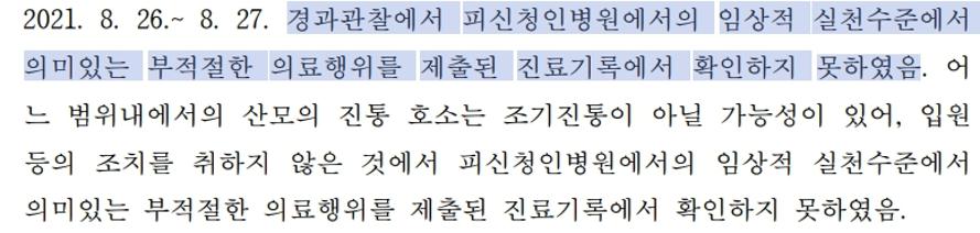 구체적으로 감정서는 "전자태아감시에서 자궁수축이 없는 것을 보아 병원 퇴원 과정에서 A병원이 임상적 실천수준에서 의미있는 부적절한 의료행위를 했다는 진료기록을 확인하지 못했다"고 평가했다.