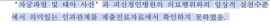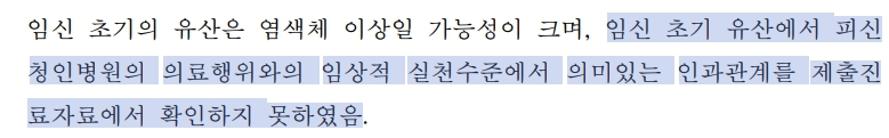 아울러 "임신 초기 유산은 염색체 이상일 가능성이 크며 임신 초기 유산에서 A병원의 의료행위와의 임상적 실천수준에서 의미 있는 인과관계를 제출자료에서 확인하지 못했다"고 덧붙였다.