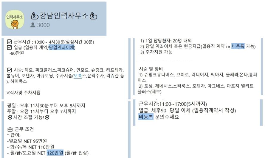 실제로 '강남인력사무소'라는 이름을 걸고 매일 100여개가 넘는 피부·미용 의료기관 일용직 구인광고가 올라오는 단체카톡방은 9월 1000~2000명 수준에서 최근 3000명까지 가입자가 늘었다.