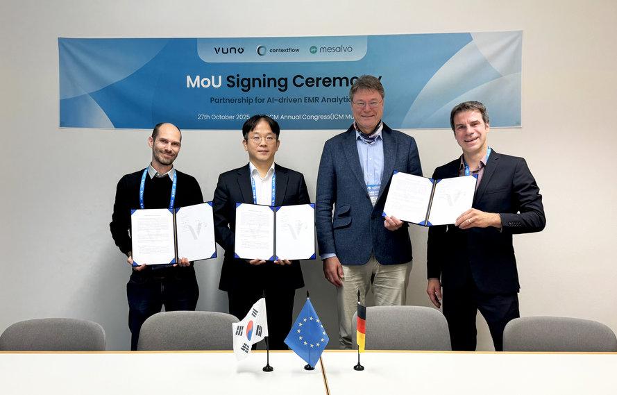 의료 인공지능(AI) 기업 뷰노는 오스트리아 영상진단 AI 기업 Contextflow, 독일 병원정보시스템(HIS) 기업 Mesalvo와 함께 AI 기반 심정지 예측 솔루션 VUNO Med®–DeepCARS®(이하 DeepCARS)의 유럽 시장 진출을 위한 전략적 업무협약(MOU)을 체결했다고 28일 밝혔다.