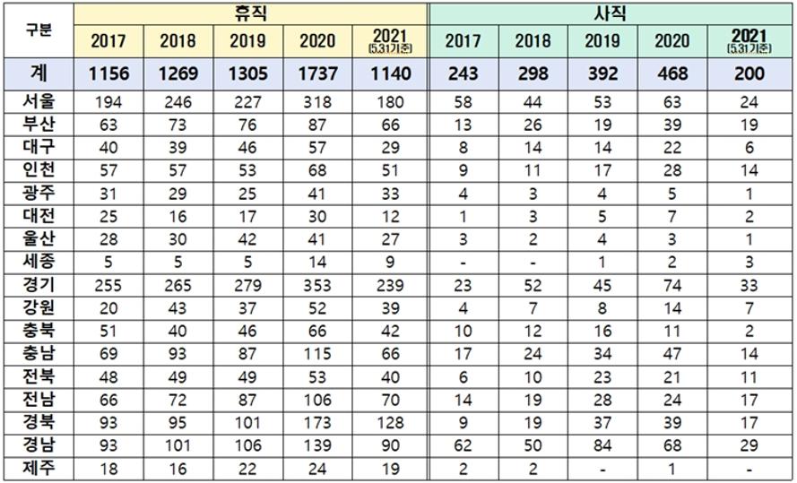 휴직자 수는 1737명으로, 2017년 1156명 보다 581명이 증가(50.2%)했다.