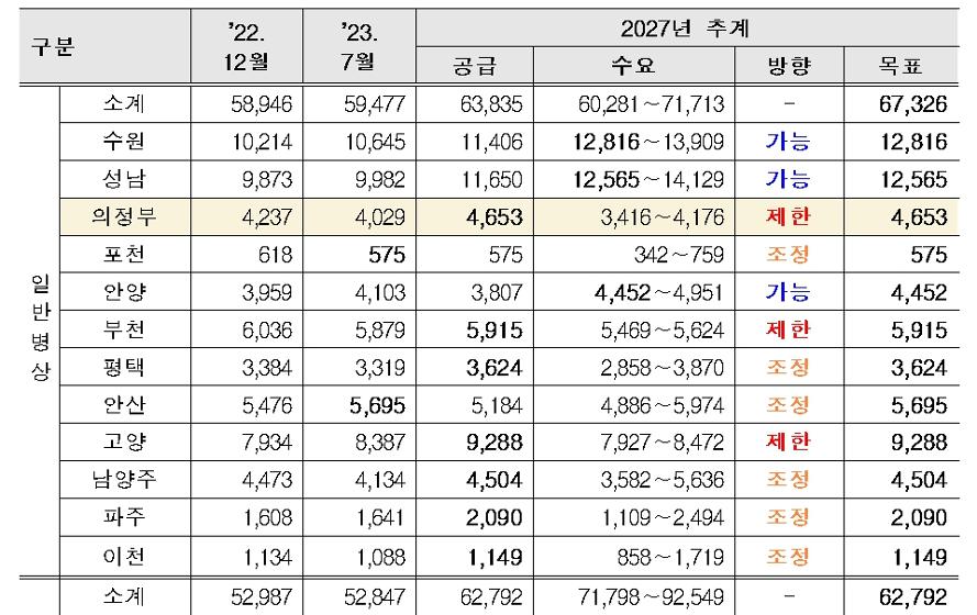 지역의사 선발 지역에 포함된 의정부는 2027년 기준 4653개 일반 병상이 공급될 것으로 예상되는데 비해 수요는 3416~4176개로 적게 추계됐다. 사진=보건복지부 병상수급관리계획