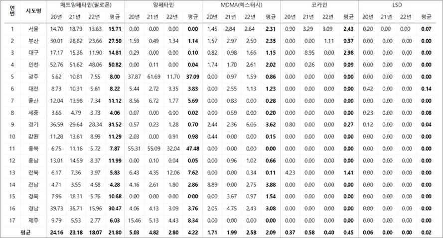 대표적인 불법마약류인 필로폰(메트암페타민)은 3년 연속 조사 대상 34개 하수처리장 모두에서 검출됐으며, 1000명당 일일 평균 사용 추정량(이하 사용추정량)은 약 20mg 내외로 나타났다.