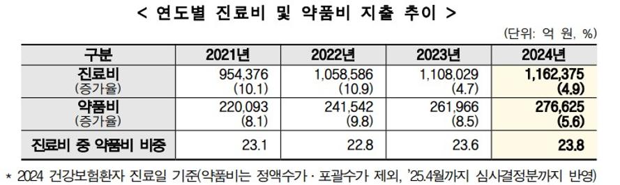 2024년 전체 진료비 증가율은 4.9%로 전년 대비 소폭 증가했다. 진료비 대비 약품비 비중은 전년(23.6%) 대비 0.2%p 증가한 23.8%를 차지한 것으로 나타났다.