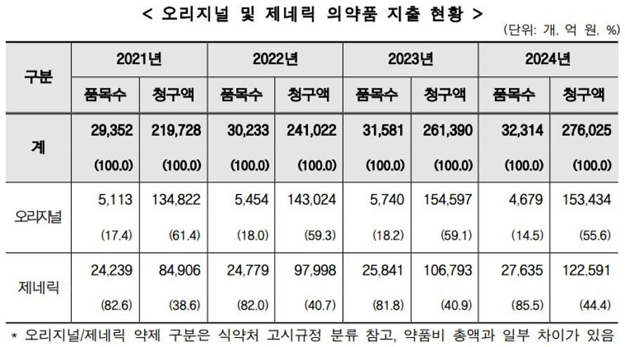 급여의약품을 오리지널과 제네릭 약제로 구분해 보면, 2024년 기준, 오리지널 의약품 지출액은 15조3434억원으로 55.6%, 제네릭은 12조2591억원으로 44.4%를 차지했다. 제네릭 청구액 비중은 2021년 38.6%, 2022년 40.7%, 2023년 40.9%, 2024년 44.4%로 매년 증가세를 보였다.