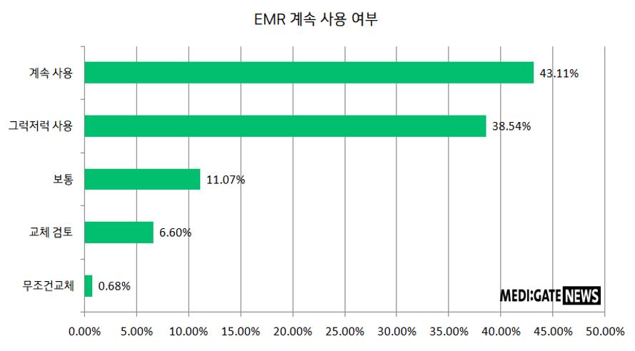 현재 사용하고 있는 EMR을 앞으로도 사용하길 원하는지에 대한 질문은 ‘계속 사용’이 43.11%과 ‘그럭저럭 사용’이 38.54%로 전체의 80% 이상을 차지했다. 보통은 11.07%였고 교체를 검토하는 것은 6.60%, 무조건 교체는 0.68%로 교체는 10% 미만으로 나왔다.