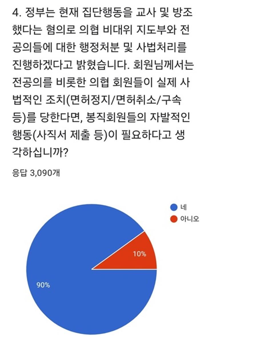특히 '전공의를 비롯한 의협 회원들이 실제 사법적인 조치(면허정지·면허취소·구속 등)를 당한다면, 봉직 회원들의 자발적인 행동(사직서 제출 등)이 필요하다고 생각'하느냐는 질의에 대해선 90%(2782명)가 '그렇다'고 답했다.