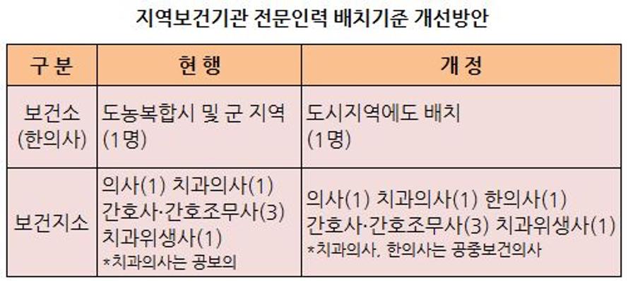 현행 지역보건법 시행규칙은 보건소 전문인력 중 한의사의 경우 농어촌지역에 한해 배치하도록 규정하고 있다.