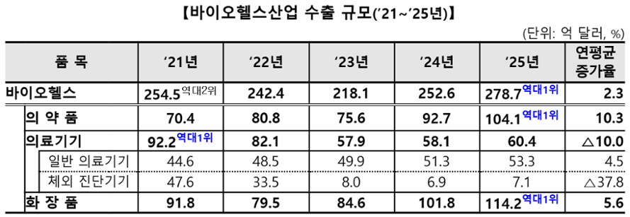 2025년 제약·바이오, 의료기기, 화장품 등 바이오헬스산업은 관세 등 불확실한 여건 속에서도 수출액 279억달러를 달성해 전년 대비 10.3% 증가했다. 이는 역대 최대 실적으로 국내 주력산업 중 8위를 기록했다.